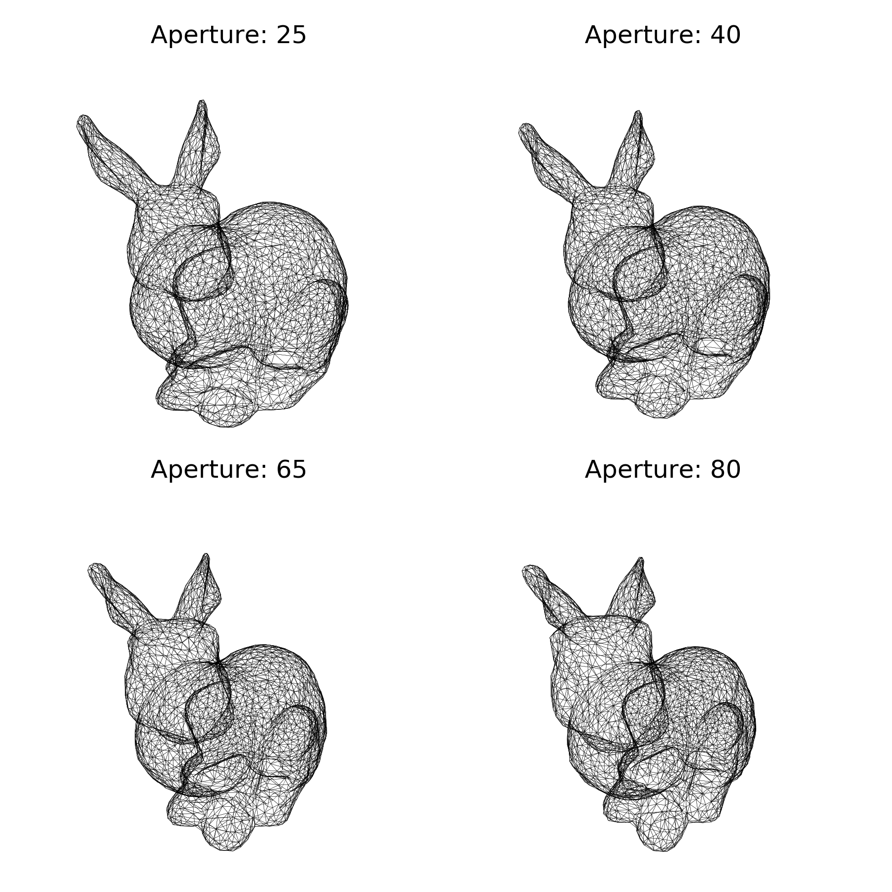 Let’s now play a bit with the aperture such that you can see the difference. Note that we also have to adapt the distance to the camera in order for the bunnies to have the same apparent size (bunny-5.py):